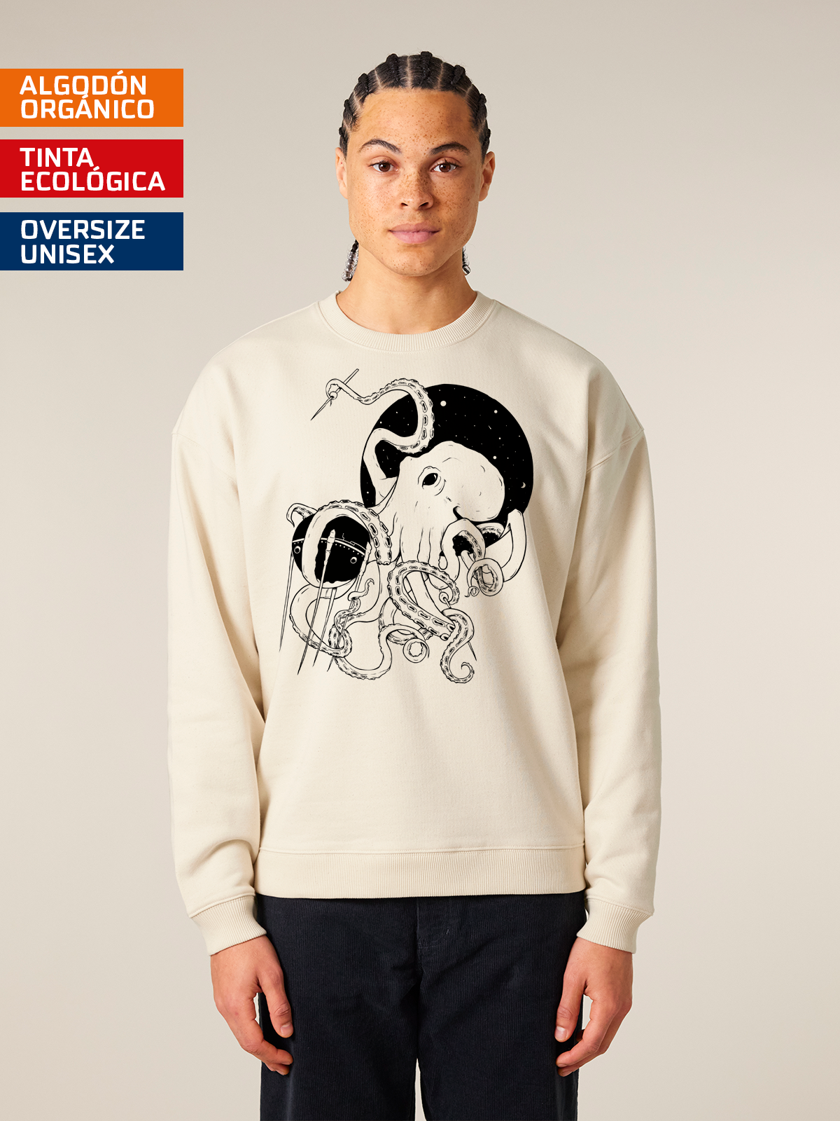 En La Cosmonauta sólo usamos tintas al agua, las menos perjudiciales para el medioambiente y algodón orgánico. Nuestros proveedores cuentan con una gestión ética y sostenible en todos sus procesos. Para nosotros es muy importante que estén comprometidos socialmente en los lugares de origen, cumplan el convenio de Ginebra sobre trabajo infantil y respeten al máximo el medioambiente.