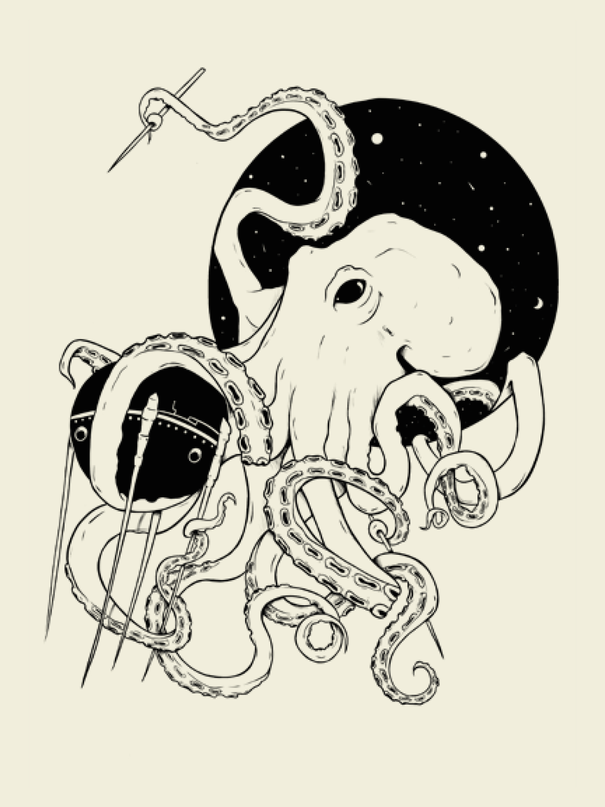Hay cientos de términos que unen el mar y el espacio, desde las naves hasta el mar de estrellas. En este diseño unimos ambos mundos, el kraken apoderándose dl mítico Sputnik. Ilustrado por Paula Vilés, es una de nuestras prendas favoritas.